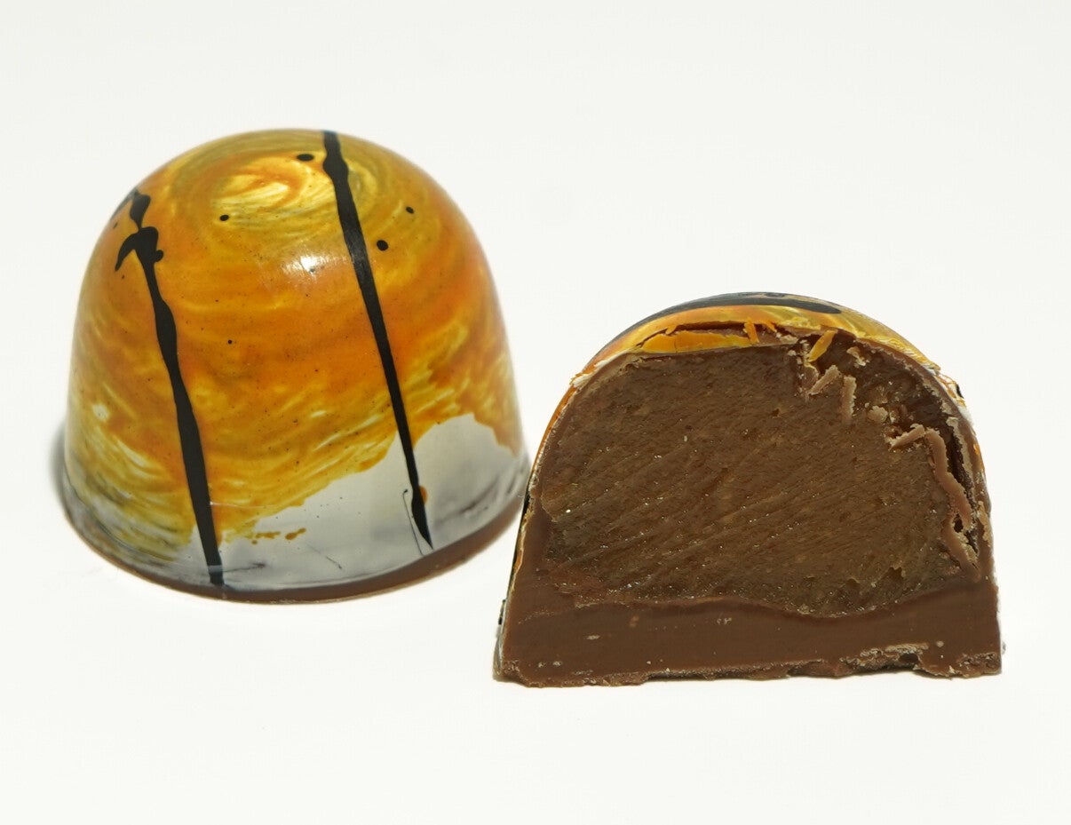 Zutaten: Kuvertüre (Vollmilch), Erdnusscreme - (Erdnüsse, Puderzucker), Sahne 30% Fett, Kuvertüre (weiß) (Emulgator), Glukosesirup hell(Gluten, Weizen, Säuerungsmittel, Aroma), Butter